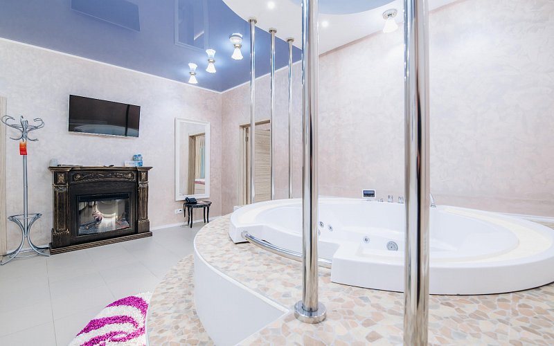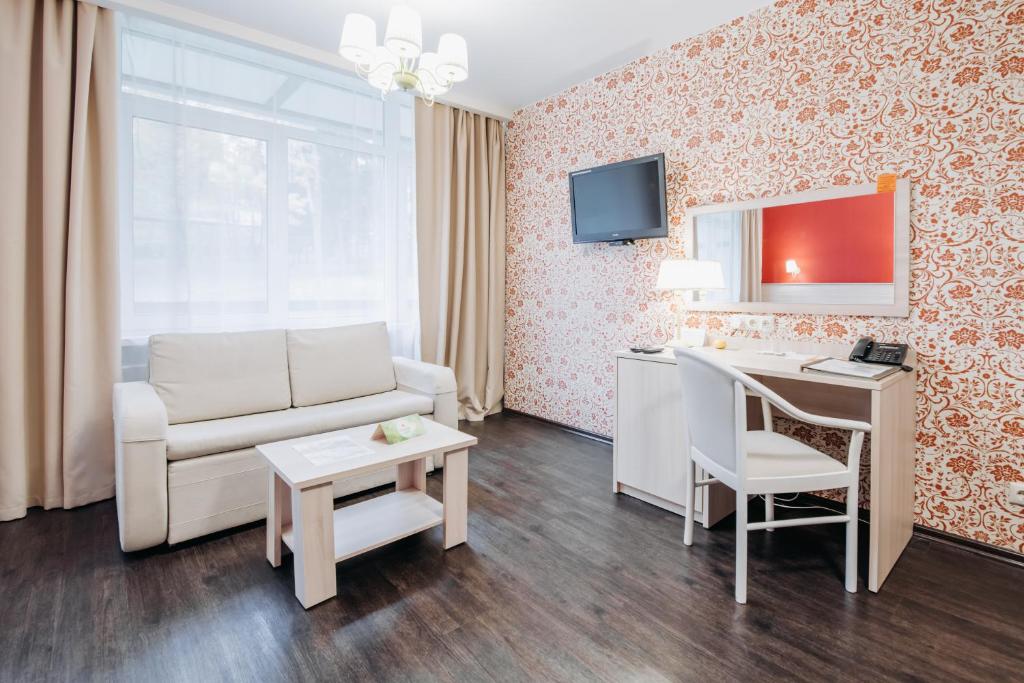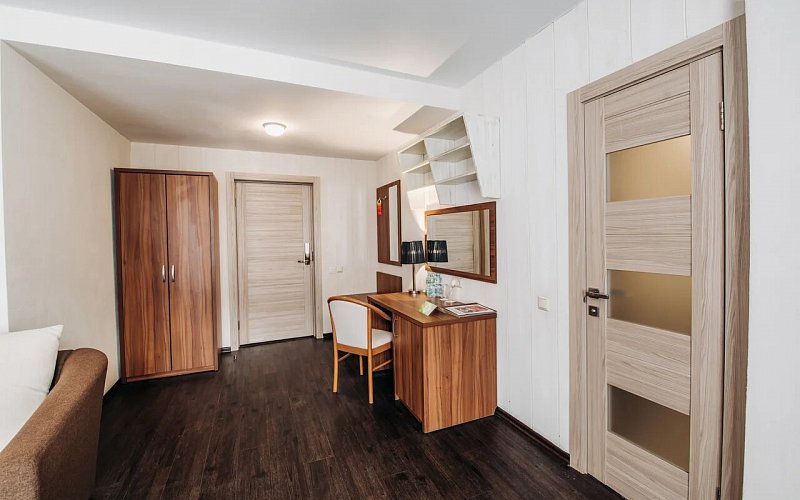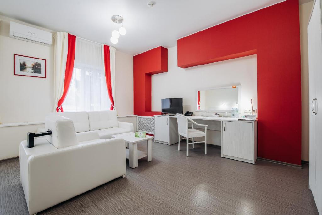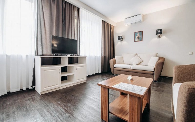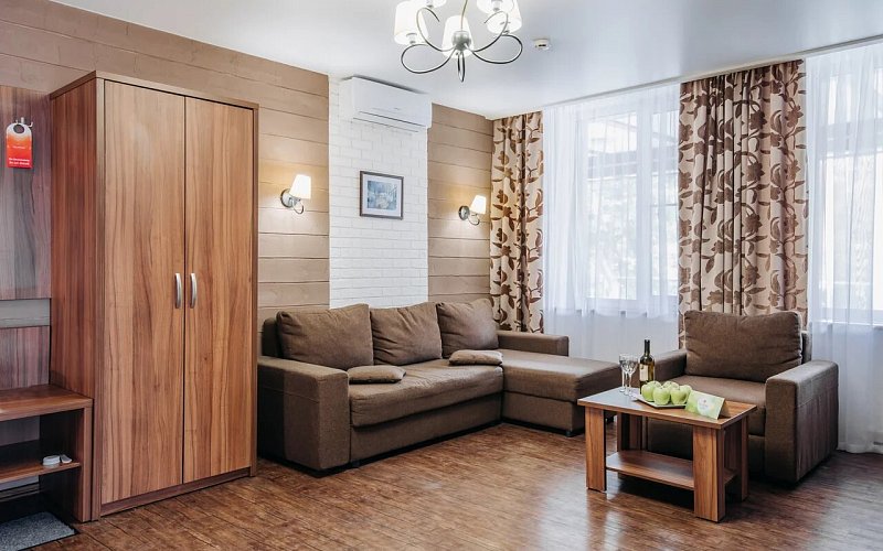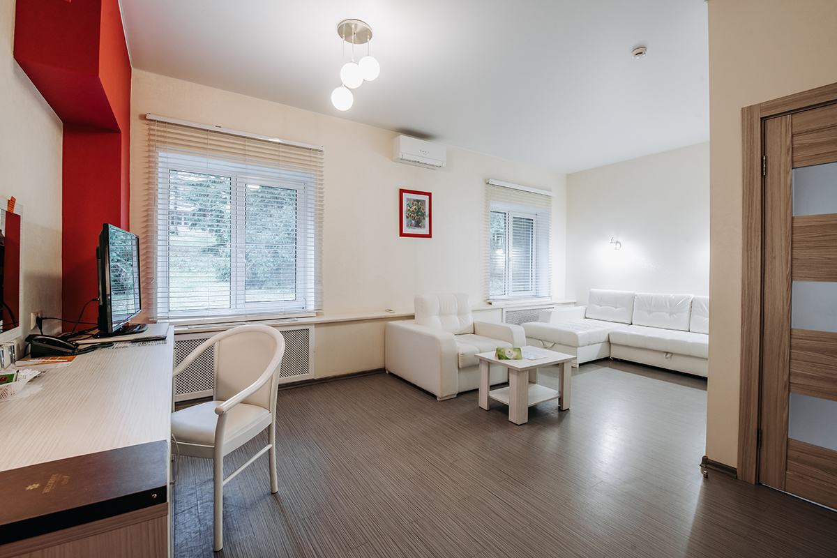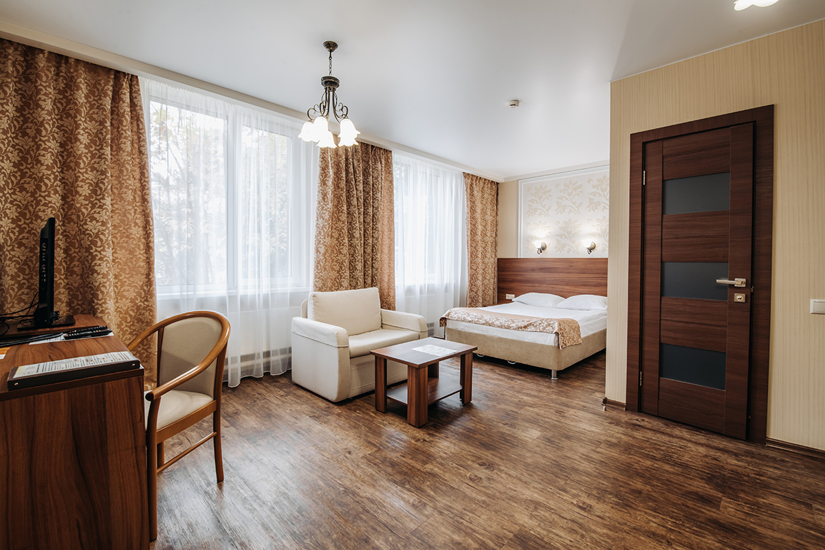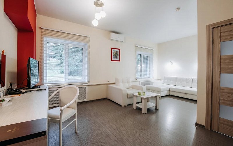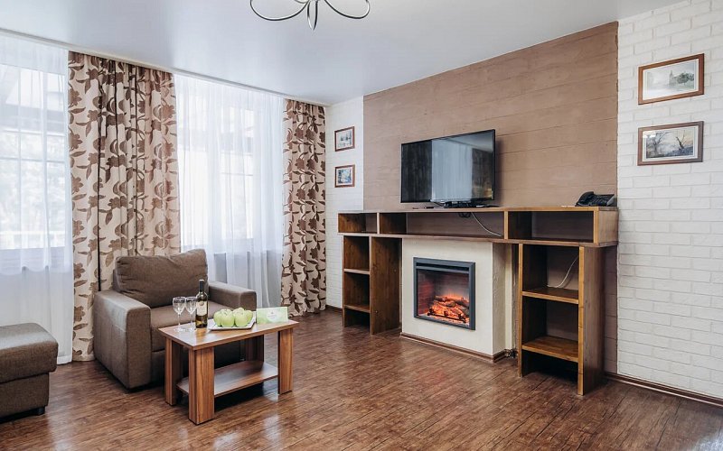 В номере: угловой диван, кресло, журнальный столик, шкаф, вешалка, мебельный гарнитур с телевизором, электрокамин, телефон, двуспальная кровать, прикроватные тумбочки, светильники, настольная лампа, шкаф, стол, телевизор, мини-бар, мини-кухня (СВЧ-печь, термопот, мини-холодильник, набор посуды, раковина).