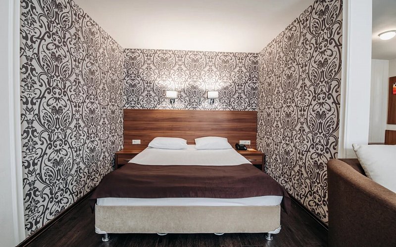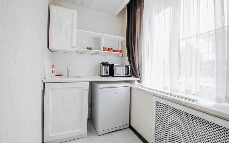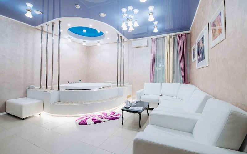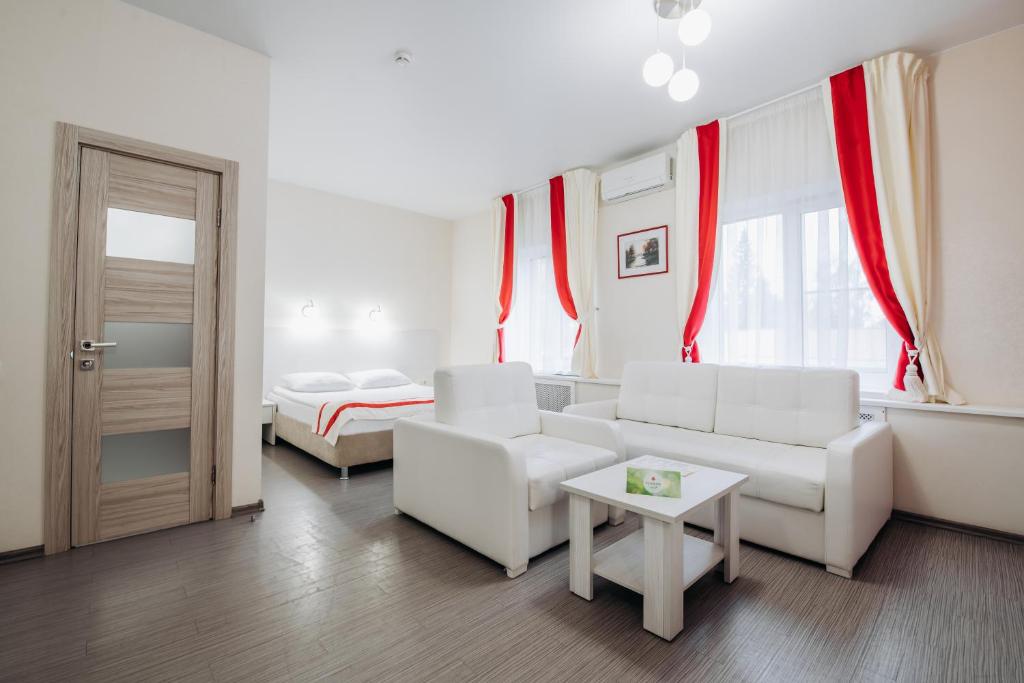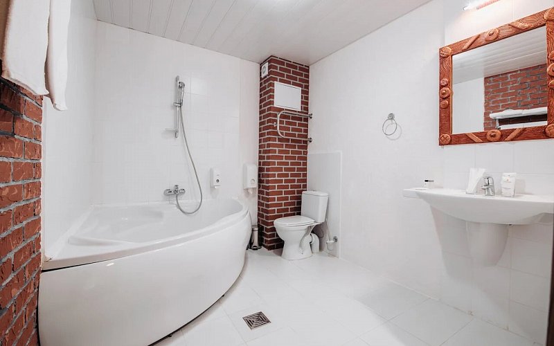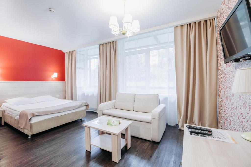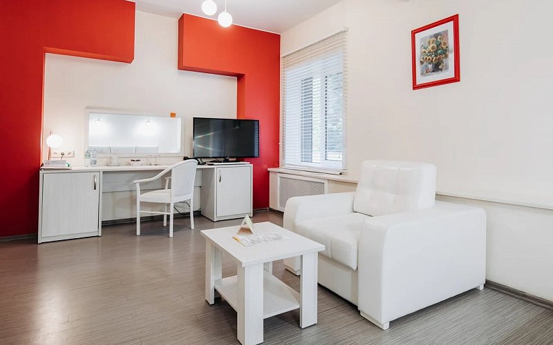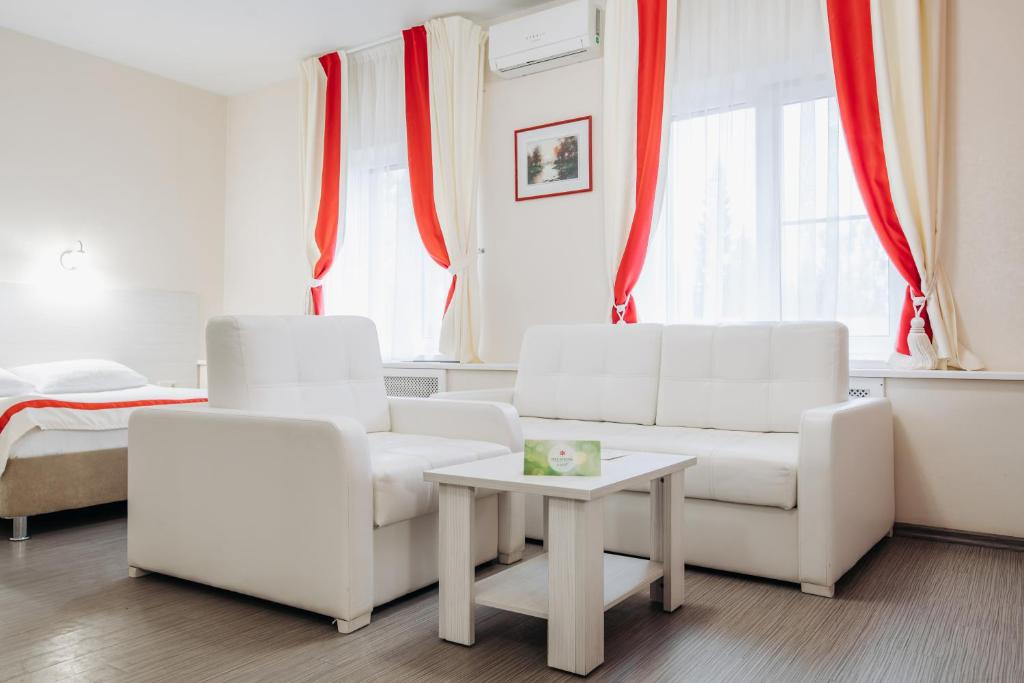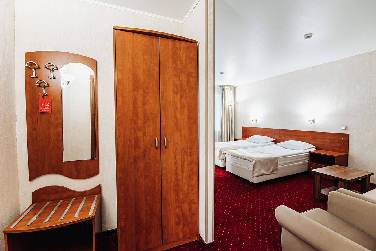 В номере: угловой диван, кресло, журнальный столик, шкаф, вешалка, мебельный гарнитур с телевизором, электрокамин, телефон, двуспальная кровать, прикроватные тумбочки, светильники, настольная лампа, шкаф, стол, телевизор, мини-бар, мини-кухня (СВЧ-печь, термопот, мини-холодильник, набор посуды, раковина).