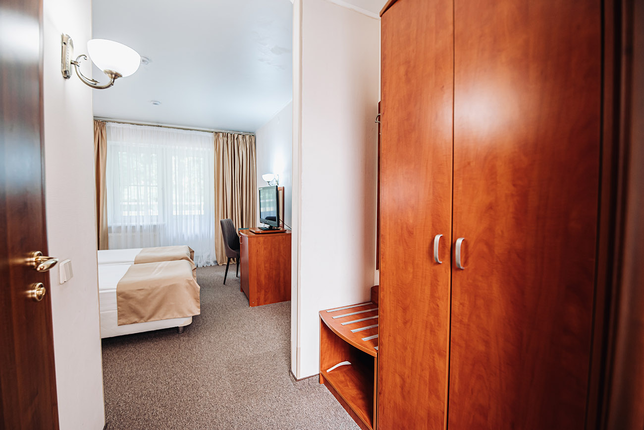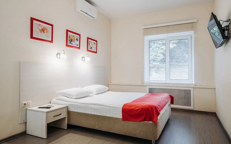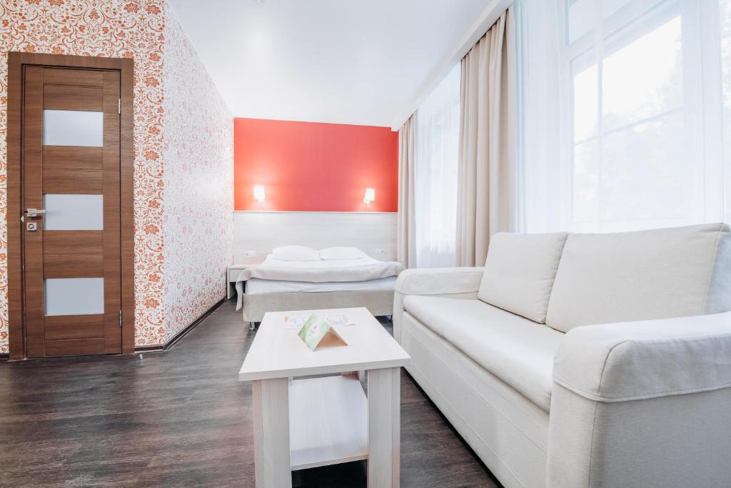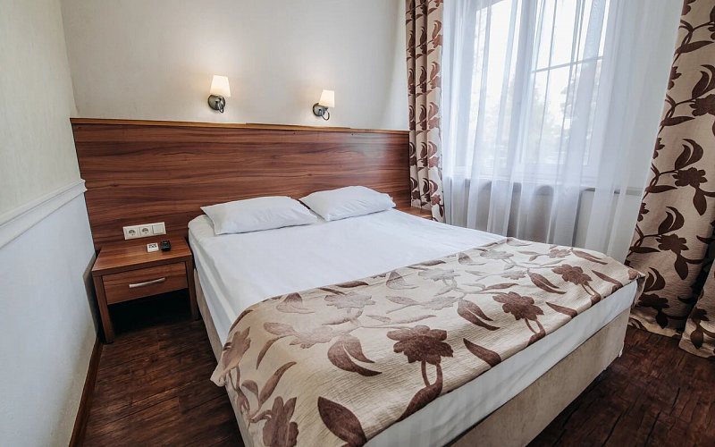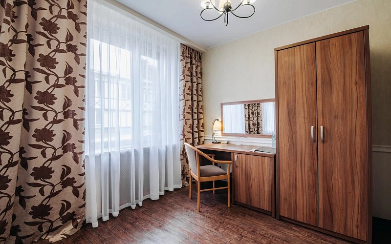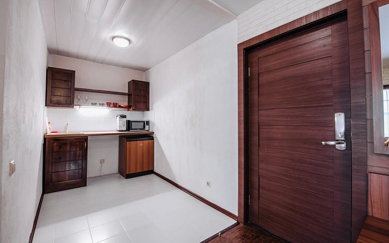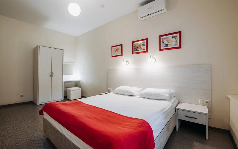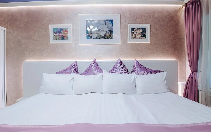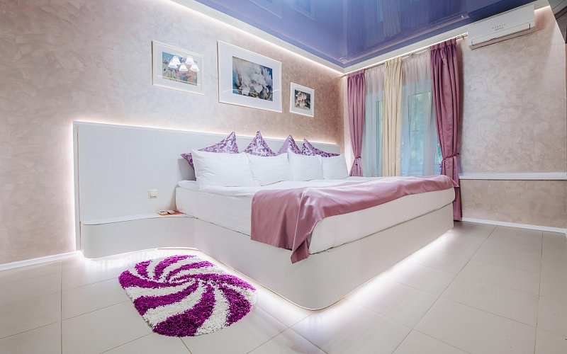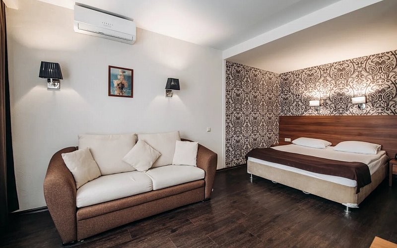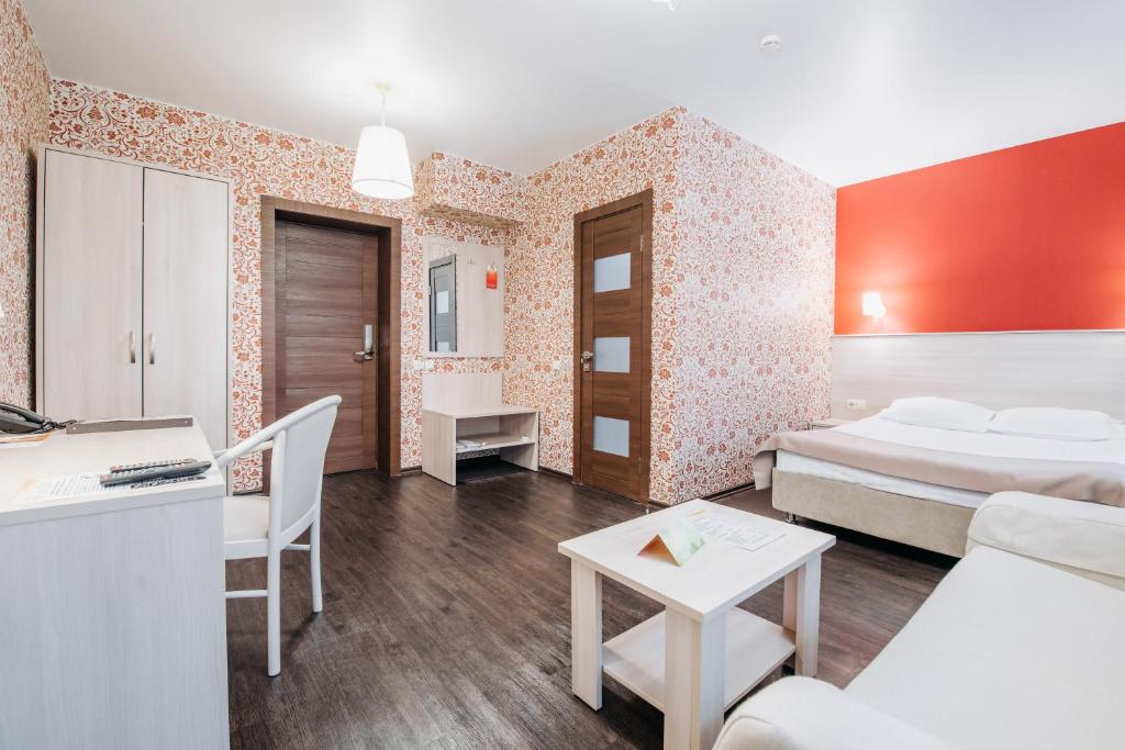 В номере: угловой диван, кресло, журнальный столик, шкаф, вешалка, мебельный гарнитур с телевизором, электрокамин, телефон, двуспальная кровать, прикроватные тумбочки, светильники, настольная лампа, шкаф, стол, телевизор, мини-бар, мини-кухня (СВЧ-печь, термопот, мини-холодильник, набор посуды, раковина).