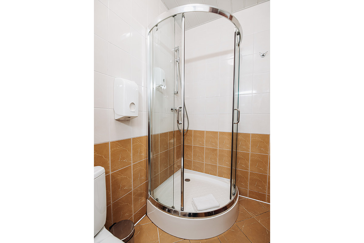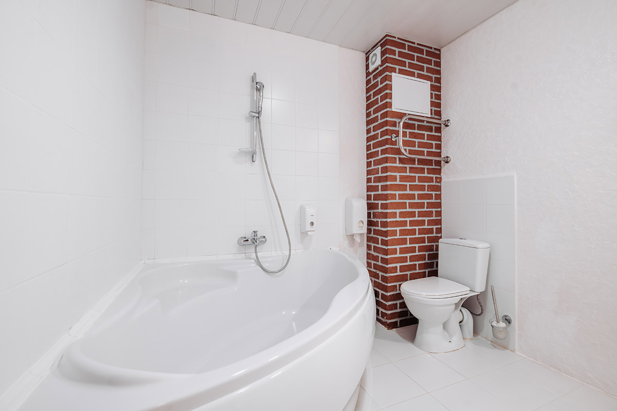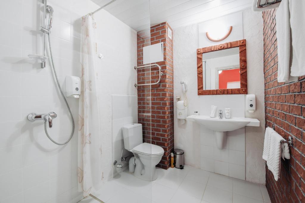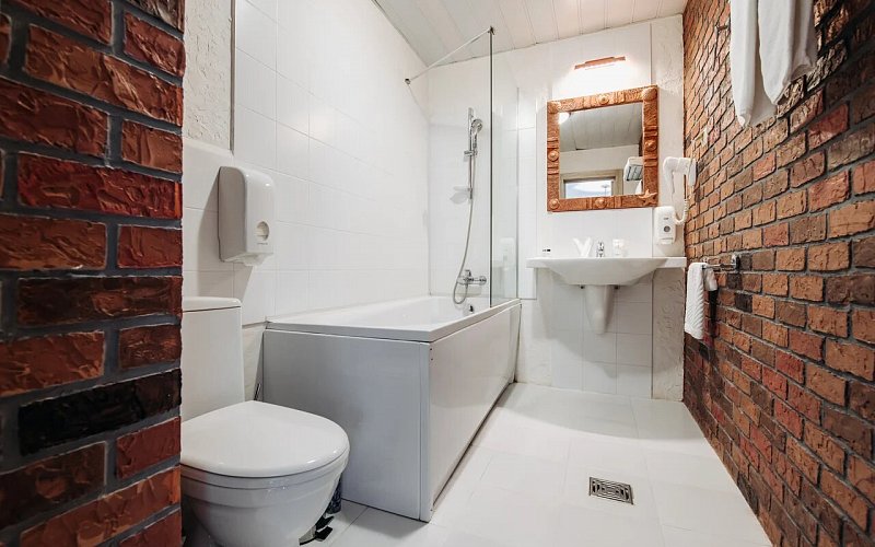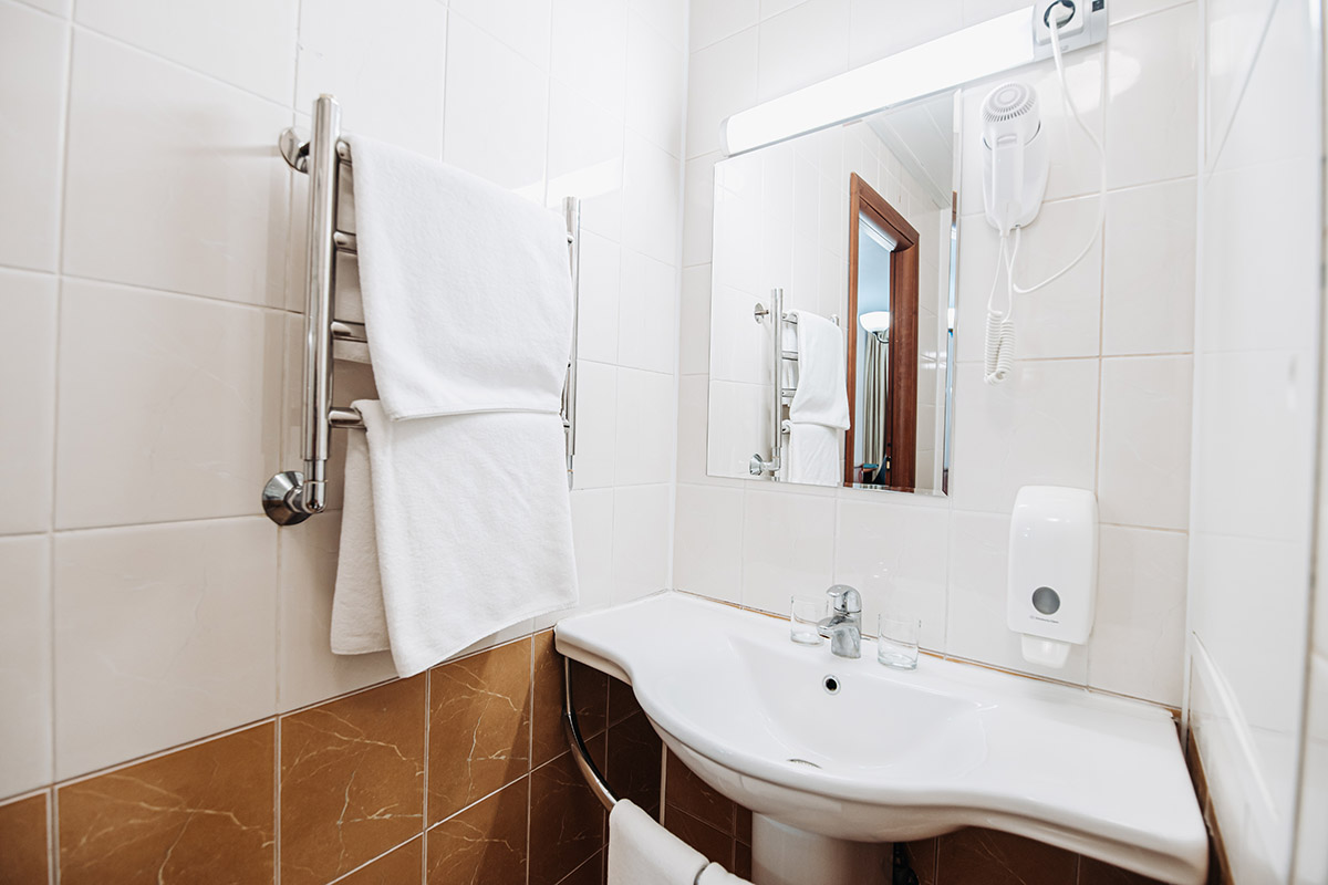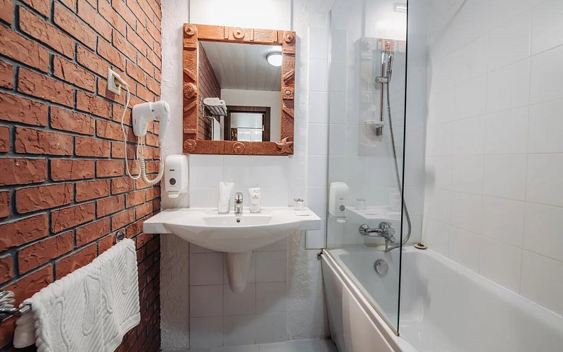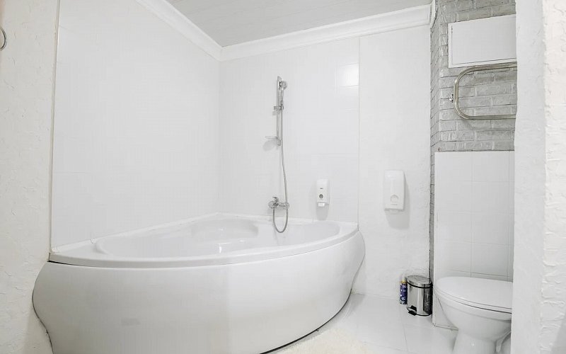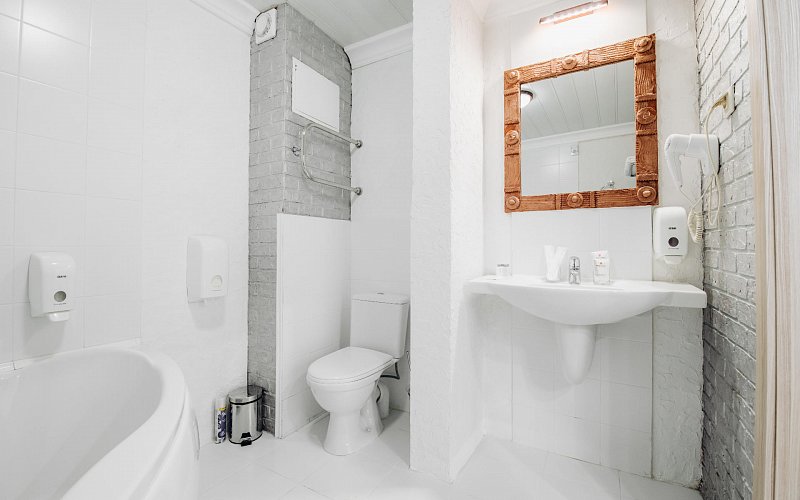 Ванная комната: ванна, фен, тапочки туалетные принадлежности.